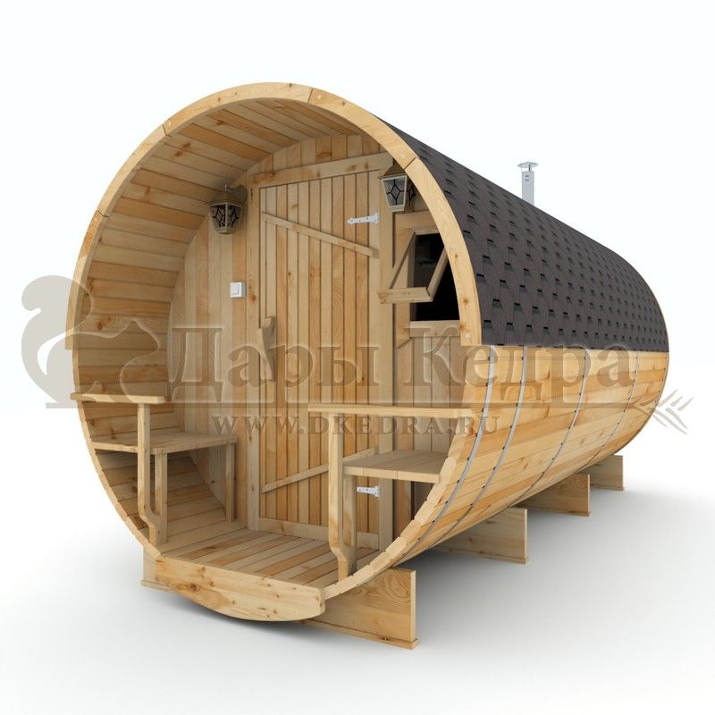 • Баня-бочка круглая из кедра 4 метра Это изделие круглой вытянутой формы с двумя отделениями: раздевалкой и парной. Лавочки из кедра находятся по всей длине бани-бочки с обеих сторон. Печь расположена в парилке около дальней стены. Для удобства пользования в раздевалке установлена вешалка и полочка из кедра. За счет небольшой конструкции баня нагревается не более 30 минут. По вашему желанию баню-бочку можно дополнить печью с внешней загрузкой, благодаря которой весь мусор после топки останется на улице. Круглая баня-бочка не требует полноценный фундамент, поэтому при необходимости ее можно перенести в другое место. Обращаем Ваше внимание, что в стандартную комплектацию бани входят лавки в парной с обеих сторон. Дополнительно можно заказать полок открытого или закрытого типа! Кедр обладает ароматическими свойствами. Он не деформируется и влагоустойчив, при правильном уходе за деревом на нем не развиваются грибки и плесень.