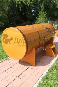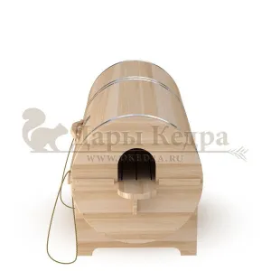 Фитобочка горизонтальная из кедра наиболее комфортна в использовании, потому что во время процедур человек принимает лежачее положение. Она оснащена откидной дверцей, которая во время открывания хорошо держится за счет джутовых веревок. Внутренняя ручка из кедра облегчает открывание и закрывании двери во время использования. Такая модель подходит для оздоровительных центров.