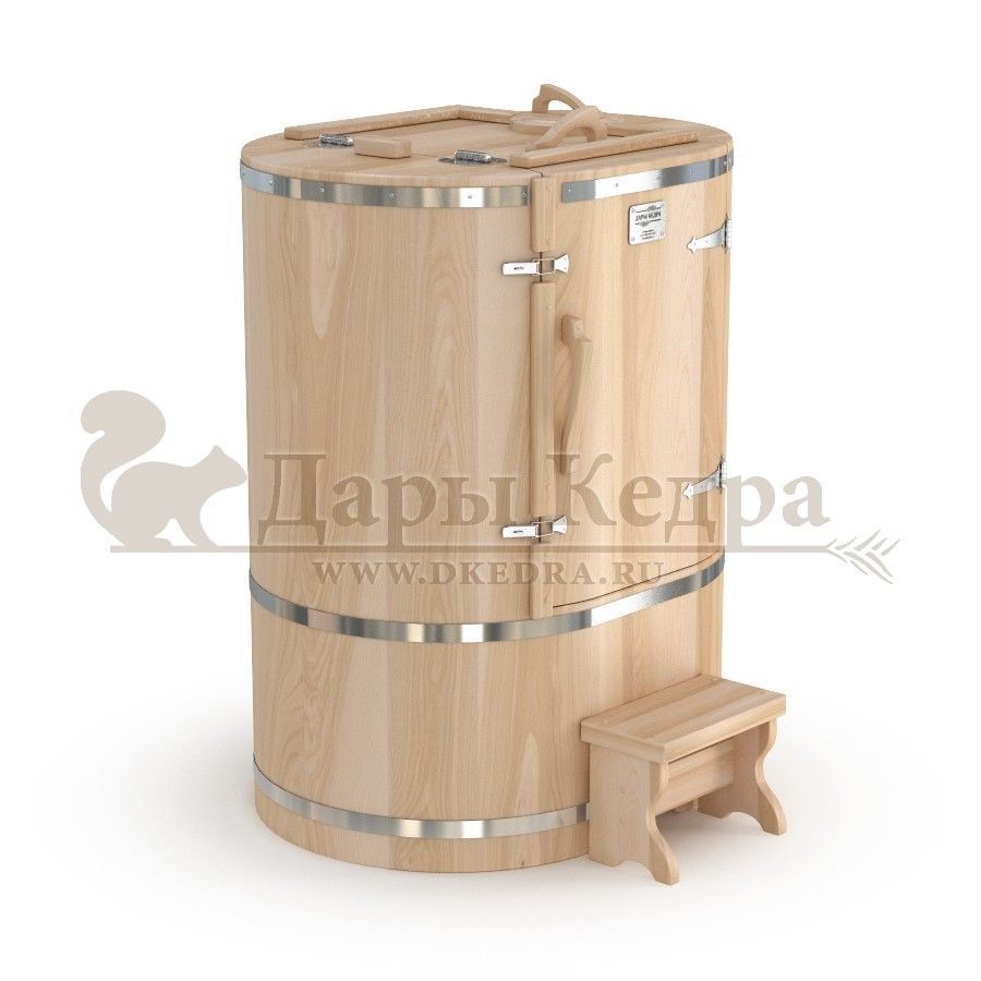 Овальная фитобочка из кедра - это мини парная, которую можно использовать не только в спа-салонах, но и дома. Овальная модель более просторна и удобна в использовании. Толщина стенок составляет 25 мм. Она оборудована откидными створками, дверцей и отверстием для головы. Во время парения человек сидит внутри кедровой бочки, а голова находится снаружи. Благодаря этому исключается возможность перегрева. Подлокотники из кедра, встроенные ручки на створках и двери делают эксплуатацию более удобной.