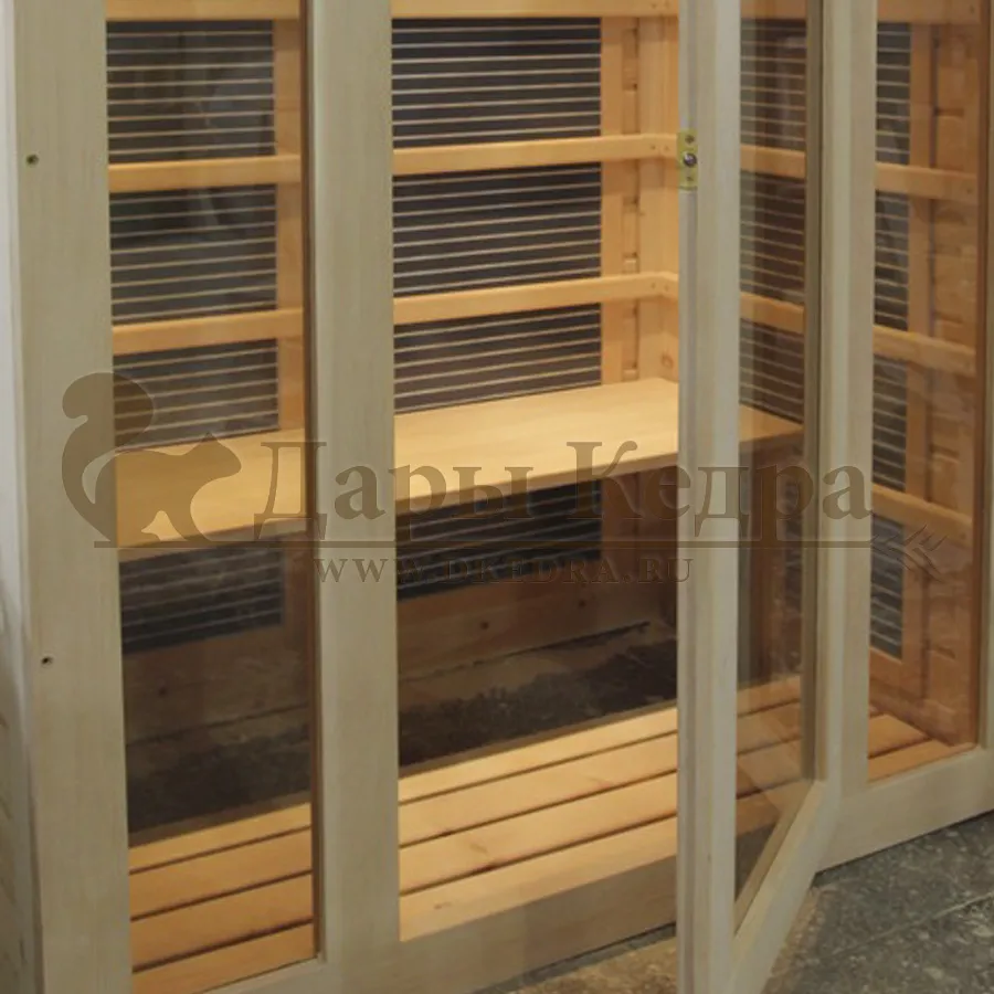 Это специально оборудованная кедровая кабина для прогрева тела человека сухим теплом. Воздух в таких парных не нагревается. Инфракрасные лучи воздействуют на тело, равномерно прогревая мышцы, суставы и органы. Карбоновые излучатели, встроенные в стены кабины, обладают мягким прогревом, что полностью исключает возможность ожога. Работает кабина за счет электричества. Пятиместная инфракрасная сауна с карбоновыми излучателями подходит для коммерции.